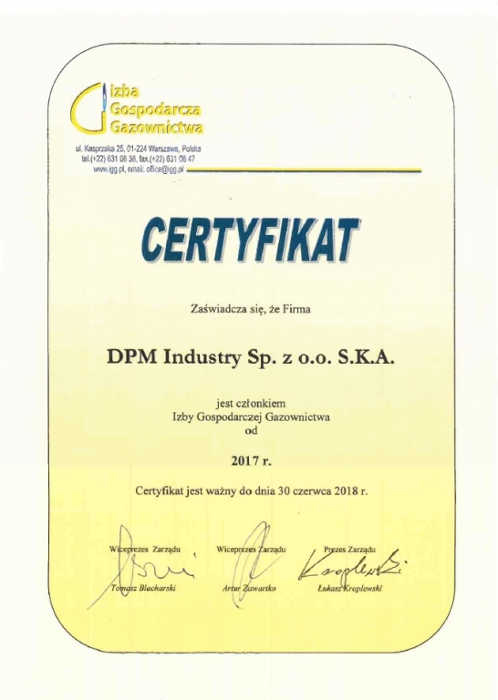 Firma DPM Industry Sp. z o.o. S.K.A. oficjalnie jest członkiem Izby Gospodaczej Gazownictwa od 2017r.